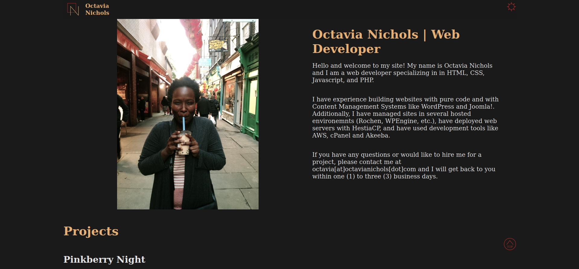 Hello and welcome to my site! My name is Octavia Nichols and I am a web developer specializing in in HTML, CSS, Javascript, and PHP.